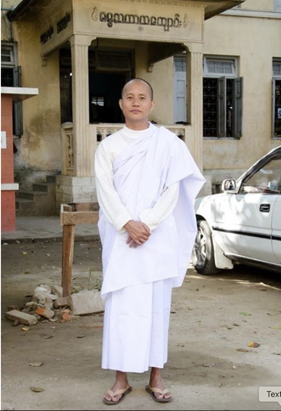 Photo of Venerable Wirathu in 2013 with white saffron robe (Image: https://democracyforburma.wordpress.com/wp-content/uploads/2013/09/1003916_326735517469963_462568100_n.jpg)